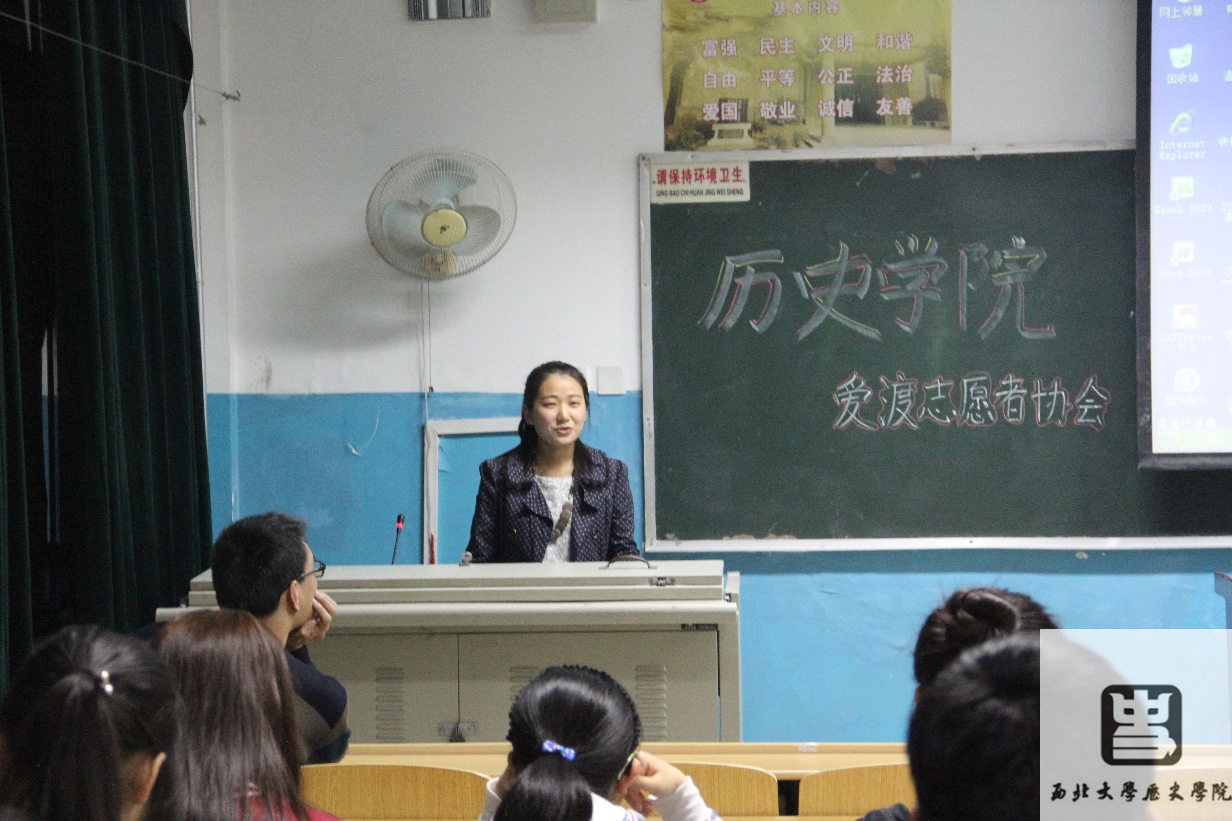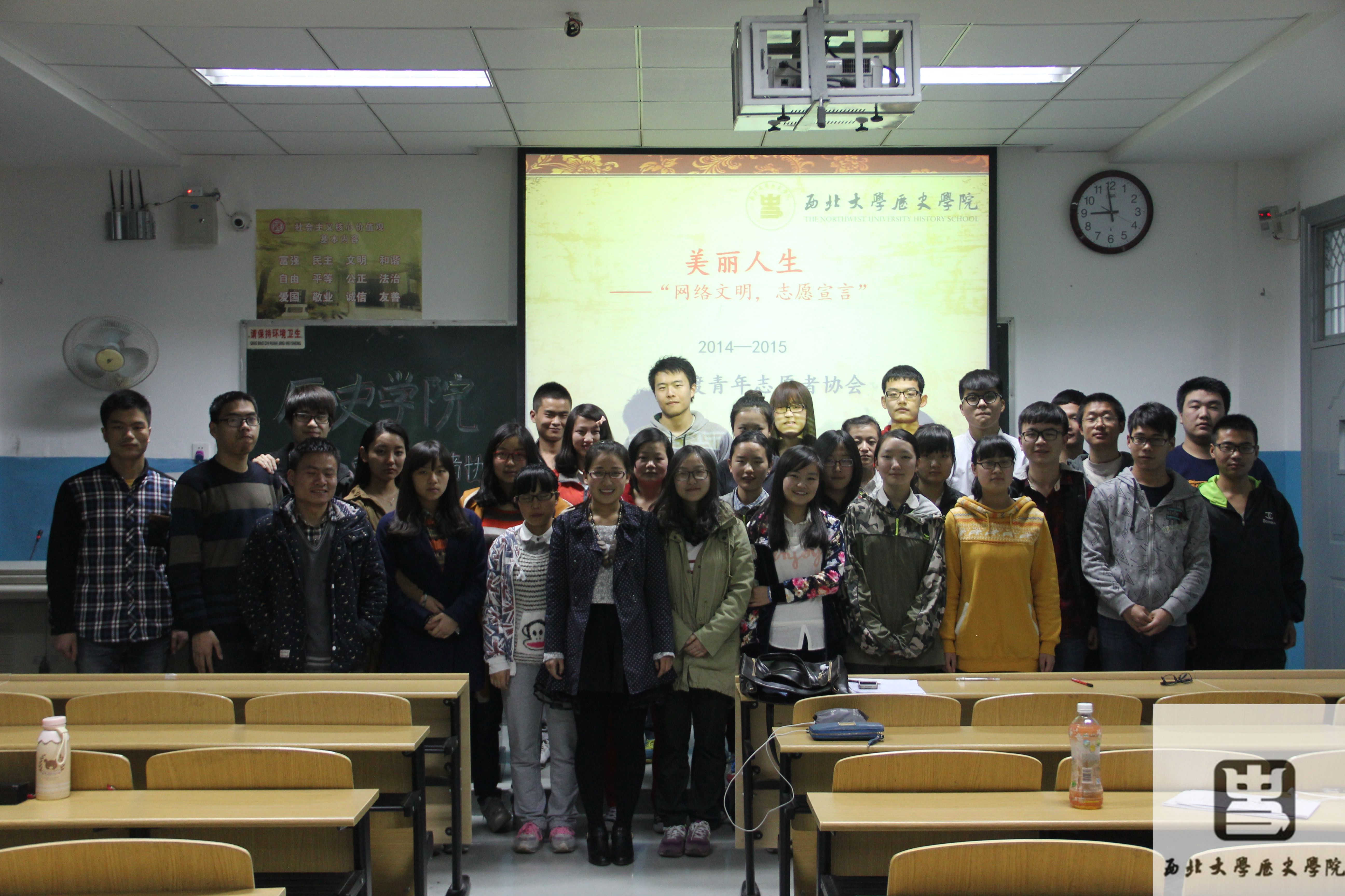 2015317日,志愿者们准时到达本次室内活动所举行的教室,有序就坐。一切准备就绪后,围绕学校倡导的“网络文明,志愿宣言”主题的室内活动便正式开始了。