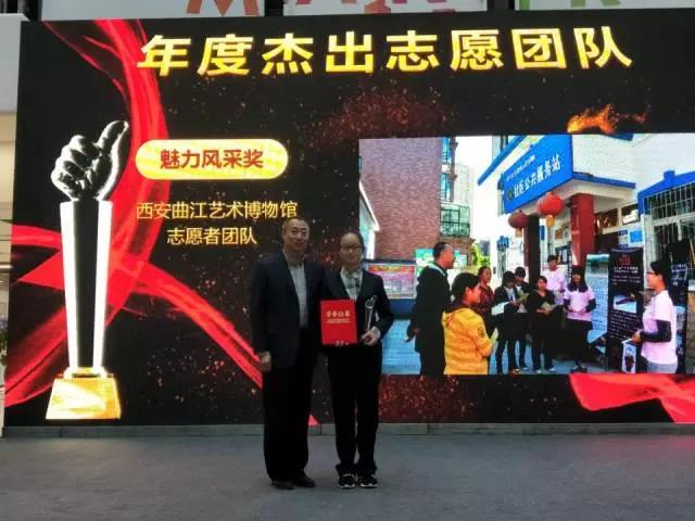 曲江新区文明办主任刘海旭为曲江艺术博物馆讲解队志愿者团队进行了颁奖,西北大学776net必赢官网曲江艺术博物馆志愿者讲解队2017级段文瑜同学作为代表上台领取“2017曲江旅游杰出志愿者团队”荣誉称号。在2017年的志愿服务中我院志愿者队伍表现优异,积极参与各项活动,生动诠释了志愿者们积极向上、富有活力的正能量。